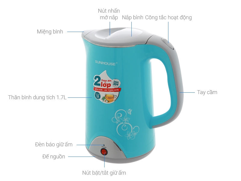 Thông số kỹ thuật Ấm siêu tốc Inox 2 lớp Sunhouse 1.7 lít SHD1388