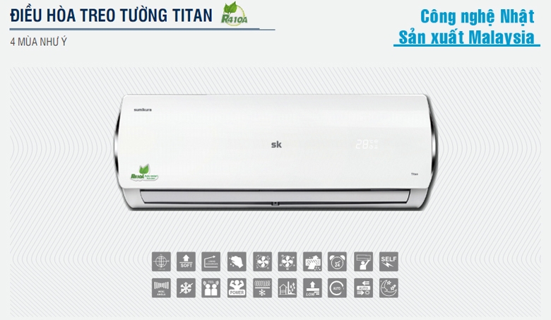 Máy điều hòa Sumikura Titan APS/APO-120 Titan loại 1 chiều công suất 12000BTU (1.5HP) sử dụng gas R22 sản phẩm mới được nhập khẩu chính hãng Malaysia với thời gian bảo hành 2 năm, 1 đổi 1 trong vòng 15 tháng.