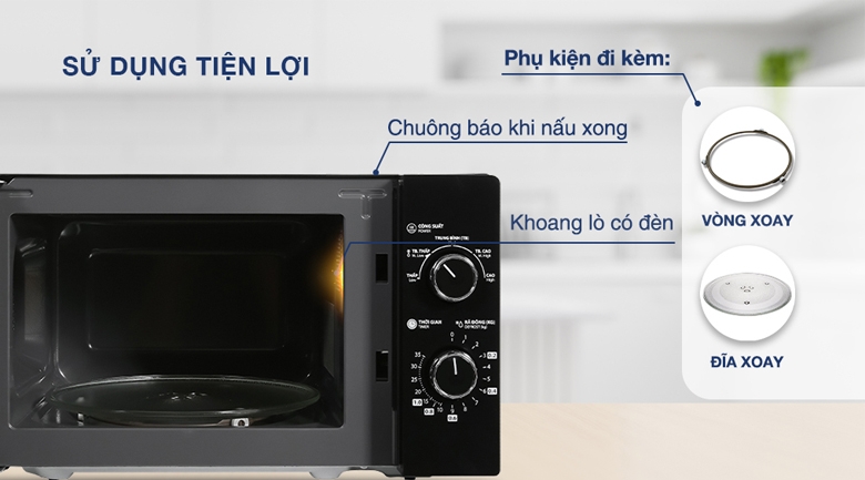 Chuông báo khi nấu xong Nút nhấn mở cửa lò Hẹn giờ lên tới 35 phút Khoang lò có đèn |