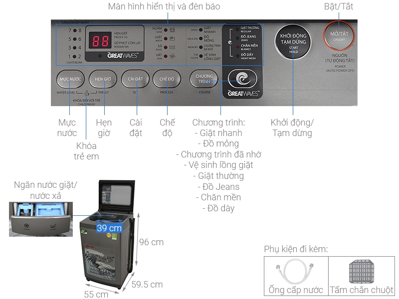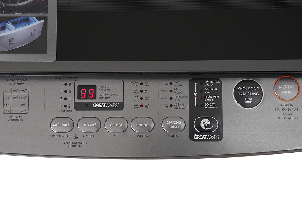 | Công nghệ giặt | Hệ thống 3 thác nước, Greatwaves kết hợp 3 luồng nước, Lồng giặt ngôi sao pha lê |