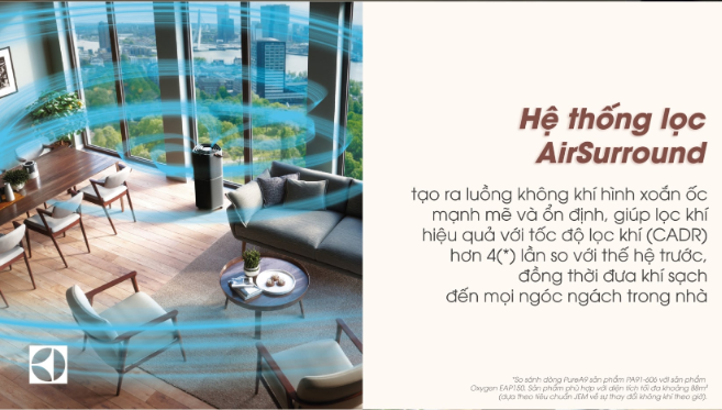 Máy lọc không khí Electrolux Inverter PA91-606DG còn được trang bị 5 lớp lọc không khí vô cùng nổi trội. Bao gồm những công nghệ lọc hiện đại có khả năng đánh bay bụi mịn: Lọc bụi thô, Lọc kháng khuẩn, Lọc HEPA, Lọc than hoạt tính và Lọc Ion hóa. Ngoài ra, hệ thống AirSurround độc đáo tạo ra một luồng không khí xoắn ốc mạnh mẽ giúp lọc khí hiệu quả hơn 4 lần so với thế hệ trước.