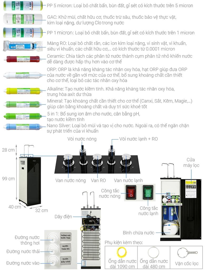 - Lõi Nano Silver (Sx Việt Nam): Loại bỏ mùi và tạo vị cho nước, ngăn chặn sự phát triển của vi khuẩn.