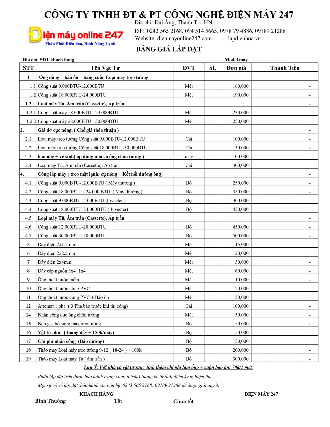 - Bảng giá lắp đặt