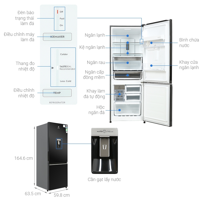 | Kích thước tủ lạnh: | Cao 164.6 cm - Rộng 59.8 cm - Sâu 57.2 cm - Nặng 65 kg |