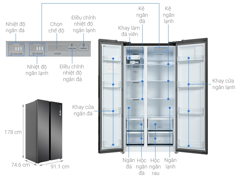 | Kích thước tủ lạnh: | Cao 178 cm - Rộng 91.1 cm - Sâu 74.6 cm - Nặng 87 kg |